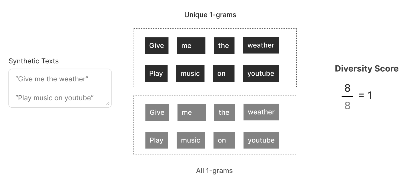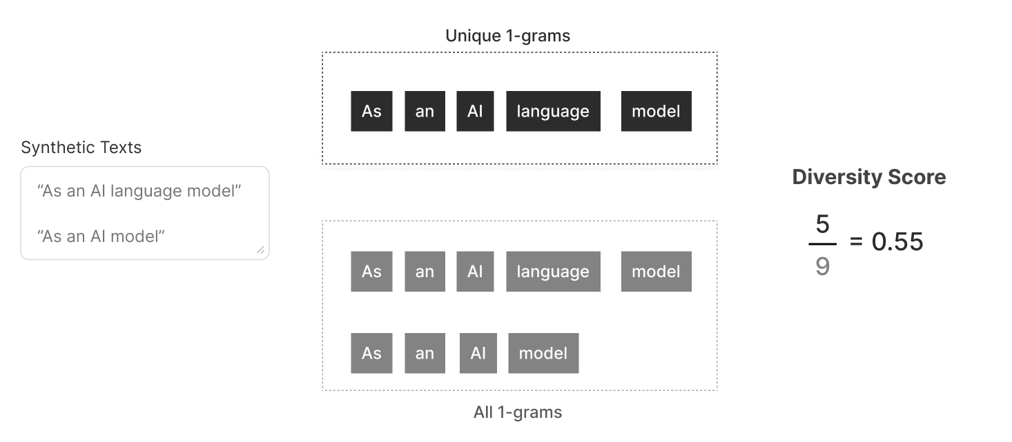 It calculates diversity as the ratio of the number of unique n-grams to the total n-grams occurring in the entire generated dataset. As shown below, the two texts contain only 5 unique unigrams out of a total of 9 unigrams and thus, the diversity score is only 55% (0.55).