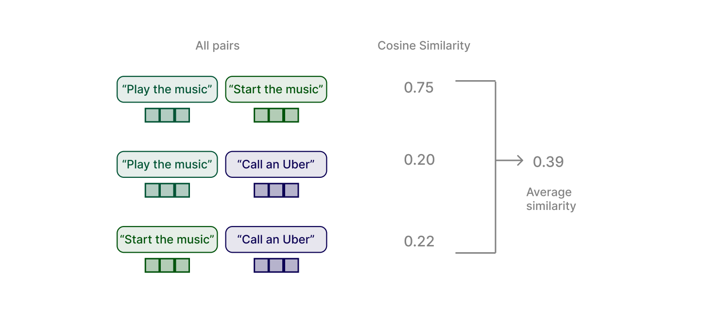 Then, we calculate the cosine similarity between all the unique pairs and take the average to get a similarity score.