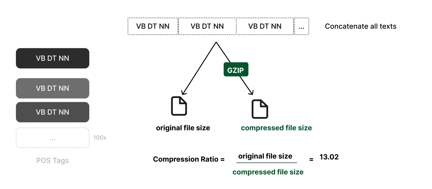 Then, the process is the same as the regular compression ratio. We concatenate the POS-tagged strings of all the texts together, compress the text using gzip, and then compare the ratio of the original file size with the compressed file size.