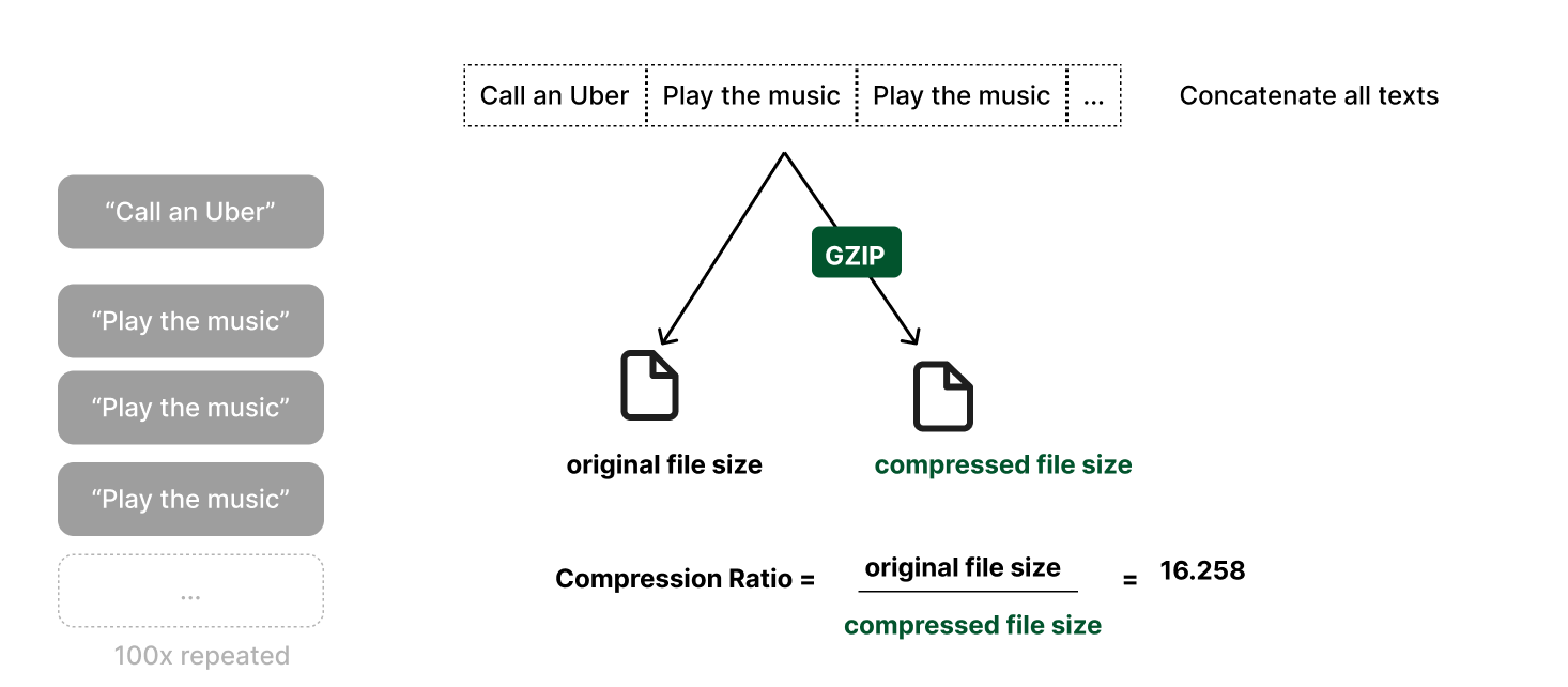 To apply this concept to texts, we can compress them using an algorithm like Gzip and then calculate the compression ratio. A higher ratio indicates lower diversity in the text. Thus, the greater the compression ratio, the less diverse the generated texts.