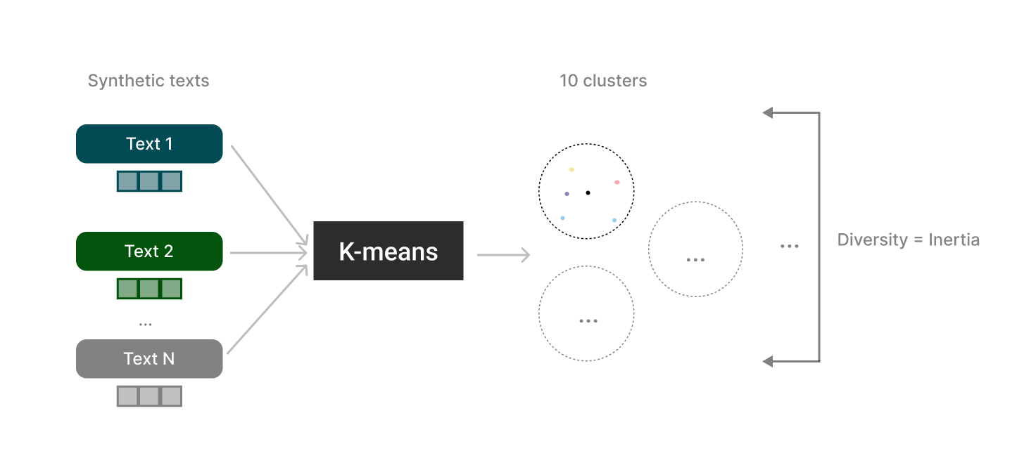 The idea is to cluster embeddings of the LLM-generated texts into 10 clusters and measure the inertia. Inertia is the sum of the squared distances between all points in a cluster and its centroid.