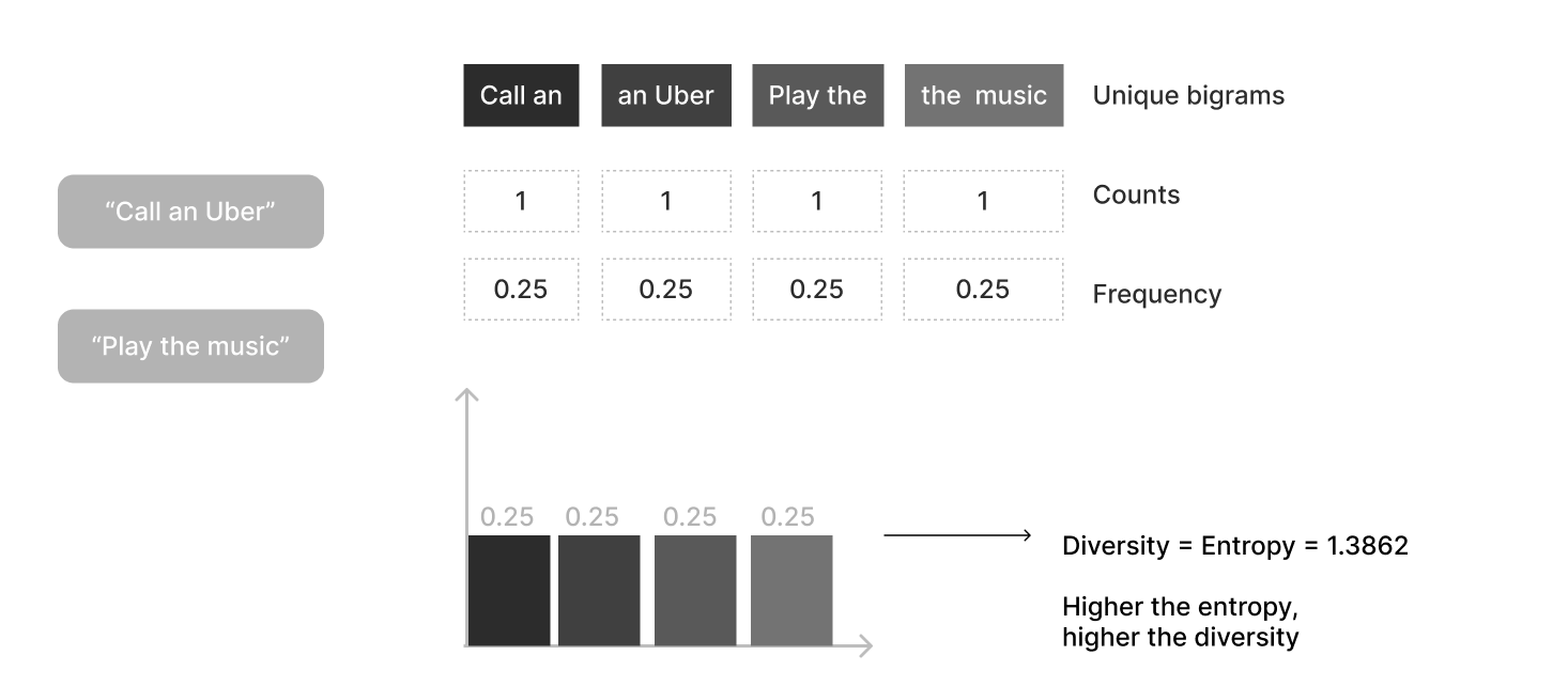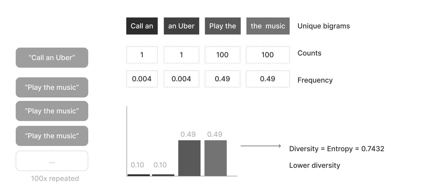 However, let’s take another case where there is lots of repetition e.g. “Play the music” being generated 100 times. In such a case, the bigrams “Play the” and “the music” would have the highest frequency. As such, the entropy would be lower, and thus, the diversity would be lower.