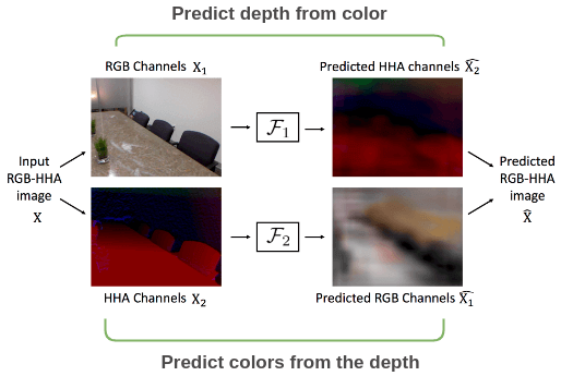 This same setup can be applied for images with depth as well where we use the color channels and the depth channels from a RGB-HHA image to predict each other and compare output image and original image.