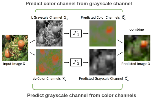 For this color image, we can split it into grayscale and color channels. Then, for the grayscale channel, we predict the color channel and for the color channel part, we predict the grayscale channel. The two predicted channels \(X_1\) and \(X_2\) are combined to get back a reconstruction of the original image. We can compare this reconstruction to the original color image to get a loss and improve the model.