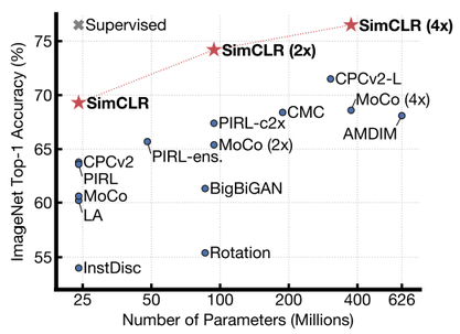 - On ImageNet ILSVRC-2012, it achieves 76.5% top-1 accuracy which is 7% improvement over previous SOTA self-supervised method Contrastive Predictive Coding and on-par with supervised ResNet50.